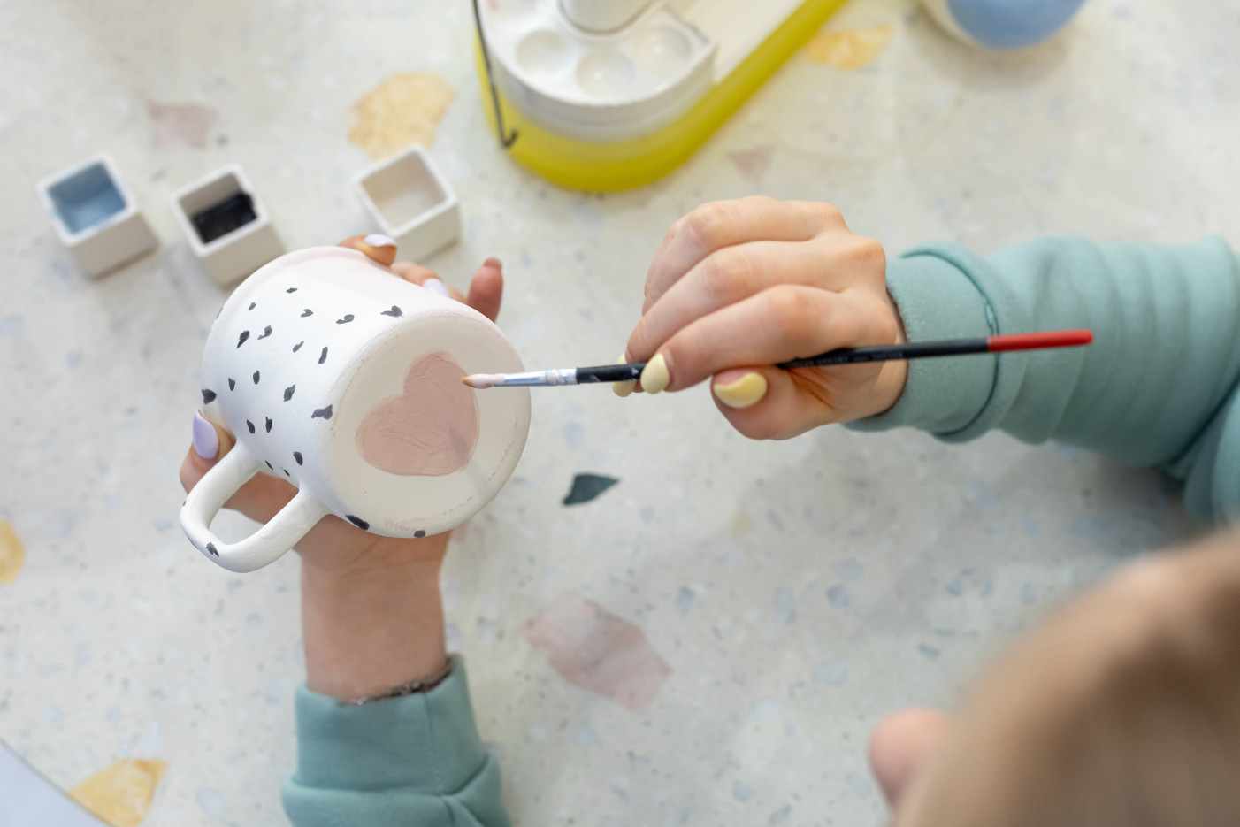 Alles, was du brauchst, wird gestellt. Die Sachen kannst du nicht gleich mitnehmen, weil sie erst gebrannt werden müssen. Du kannst sie in der Gemeinde abholen, sobald du eine Benachrichtigung bekommst.